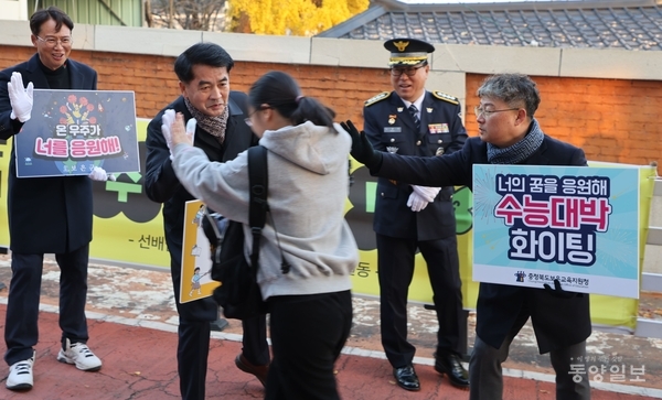 2026년도 대학수학능력시험이 실시된 13일 충북도교육청 59지구 2시험장인 영동고 정문 앞에서 정영철 영동 군수와 태영환 교육장 영동지역학부모연합회원들이 나와 수험생들을 격려하며 따뜻한 응원의 시간을 가졌다.