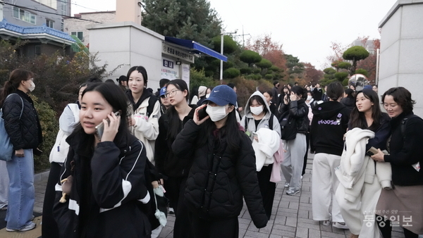 13일 대학수학능력 시험이 끝나자 수험생들이 수험장(청주여고)을 나서며 대화를 나누고 있다. 사진 오동연 기자