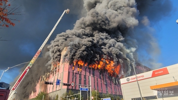 충남소방본부는 천안·아산 지역 소방서에서 소방차 등 장비 63대와 인력 129명을 투입해 화재를 진압 중이다. 소방헬기도 동원돼 상층부에 물을 뿌리며 진화 작업에 총력을 기울이고 있다.