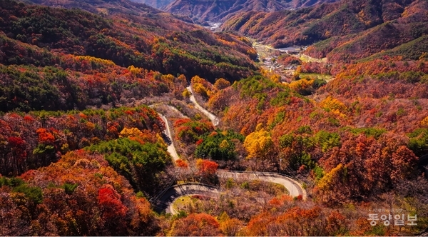 굽이마다 휘돌며 이어지는 길 위로 붉게 물든 숲이 드리워져 한 폭의 수묵화처럼 운치를 자아낸다.