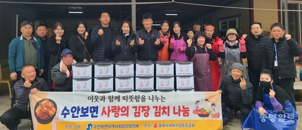 수안보면 지역사회보장협의체가 17일 연합모금사업의 일환으로 독거노인과 장애인, 한부모가정 등 60가구에 위원들이 직접 담근 김장김치를 전달하며 따뜻한 이웃사랑을 실천했다.<사진>
