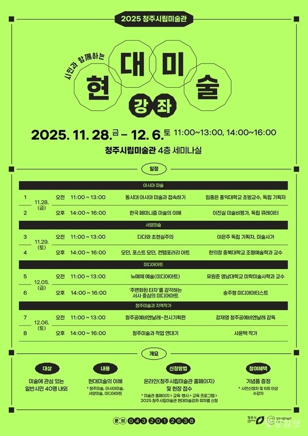 프로그램은 청주시립미술관 누리집을 통해 사전 접수가 가능하며, 현장 등록도 받을 예정이다. 사전 신청자와 총 6회 이상 수강한 시민에게는 미술관 기념품이 제공된다.
