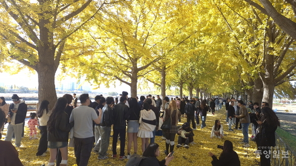 아산시 염치읍 곡교천을 따라 조성된 현충사 앞 은행나무길이 황금빛 터널에 단풍을 구경하려는 관광객들이 몰려들고 있다.
