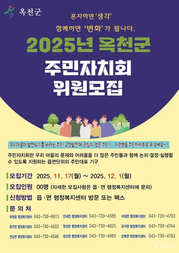 옥천군이 2기 옥천군 주민자치위원의 임기가 올해 말 종료됨에 따라 3기 옥천군 주민자치위원을 모집한다.