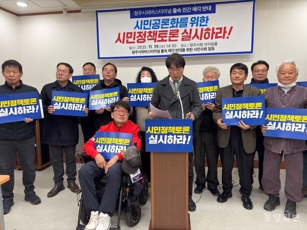 이들은 “그동안 여러 시민단체와 지역사회에서 시외버스터미널 민간 매각을 통한 현대화 추진 방식에 대한 우려를 제기해왔다”며 “이범석 시장은 여전히 기존의 민간 매각 추진 방식을 고집하고 있다”고 비판했다.