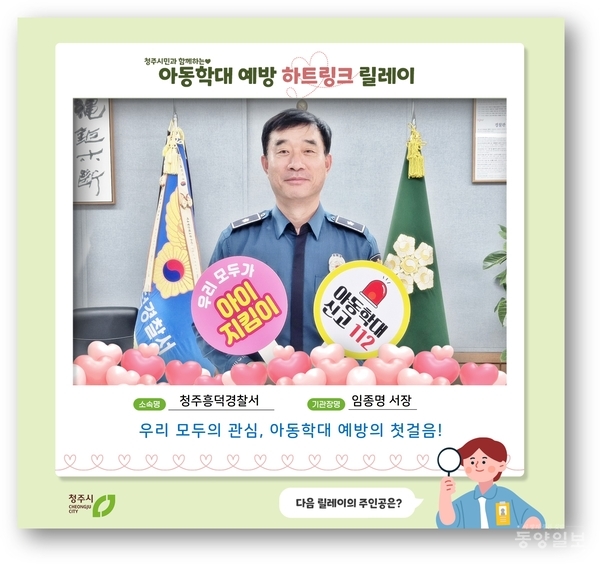 이번 릴레이에는 지난 10월 청주흥덕경찰서장으로 취임한 임종명 서장이 참여해 “우리 모두의 관심, 아동학대 예방의 첫걸음!”이라는 메시지를 시민들에게 전했다.