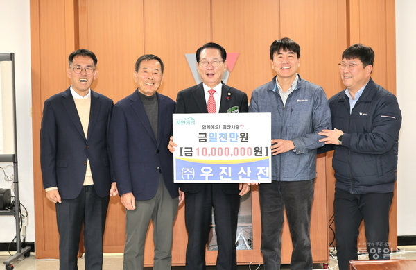 괴산군 사리면(면장 우창희)에서 기업을 경영하는 ㈜우진산전(부사장 박종훈)이 직원들과 십시일반 모금한 성금 1000만원을 사리면 기탁하고 사회공헌 활동을 했다.