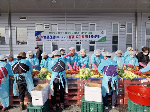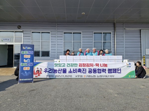 농협부여군지부(지부장 류경환)와 구룡농협(조합장 권태식)은 지난 20일 구룡농협 경제사업장에서 우리 농산물 소비촉진을 위한 김장김치 및 떡 나눔 공동협력 캠페인을 했다.