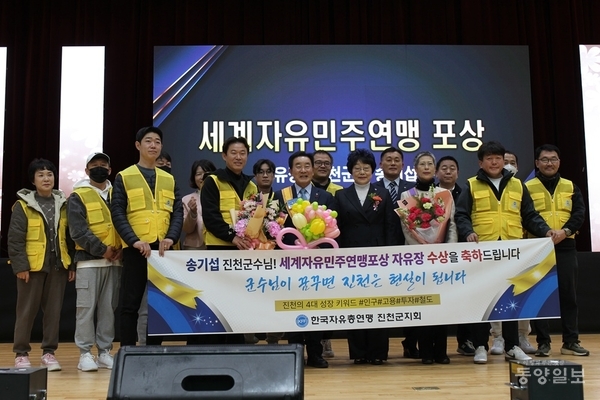 송기섭 진천군수가 22일 한국자유총연맹 창립 71주년, 충북지부 창립 61주년 기념대회에서 세계자유민주연맹(WLFD, World League for Freedom and Democracy)이 수여하는 자유장을 수상했다.