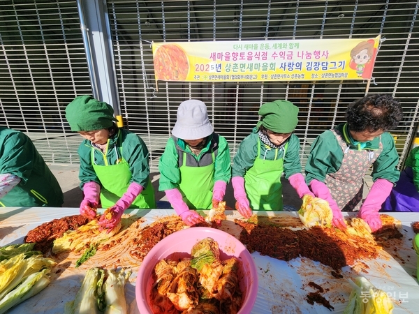 영동군 상촌면 새마을지도자회(회장 서태수)와 새마을부녀회(회장 윤손희)가 20일과 21일 사랑의 김장 나눔행사를 통해 지역사회에 따뜻한 사랑을 전했다.