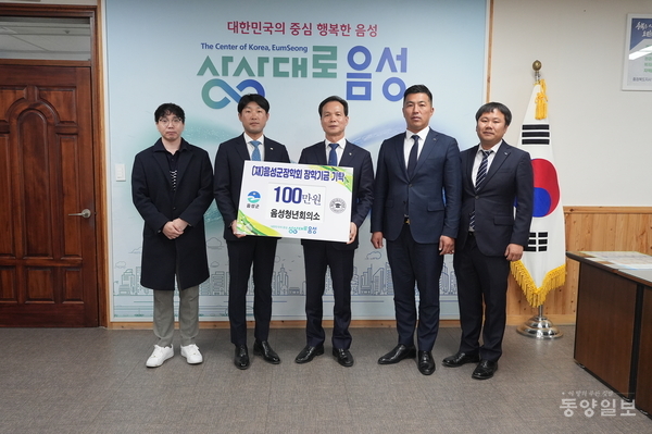 음성군 음성청년회의소 이재복 회장과 회원들이 지난 21일 군을 방문해 십시일반 모금한 성금 100만원을 (재)음성군장학회(이사장 조병옥)에 기탁하고 우수 인재 육성에 힘을 보탰다.