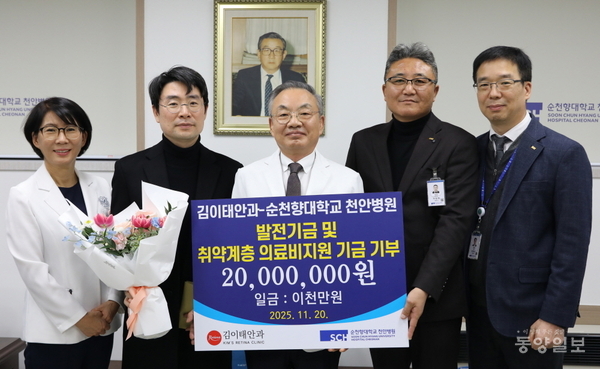 순천향대 천안병원(병원장 이문수)은 천안 김이태안과(대표원장 김이태)로부터 2000만원의 기부금을 받았다고 22일 밝혔다.