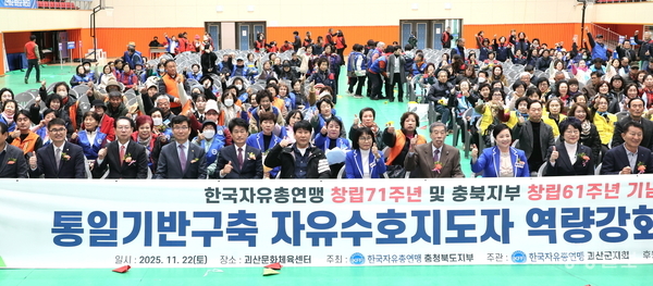 한국자유총연맹 괴산군지회(회장 송석규)가 지난 22일 괴산문화체육센터에서 ‘통일기반 구축 자유 수호 지도자 역량 강화 전진대회’를 열고 화합을 다졌다.