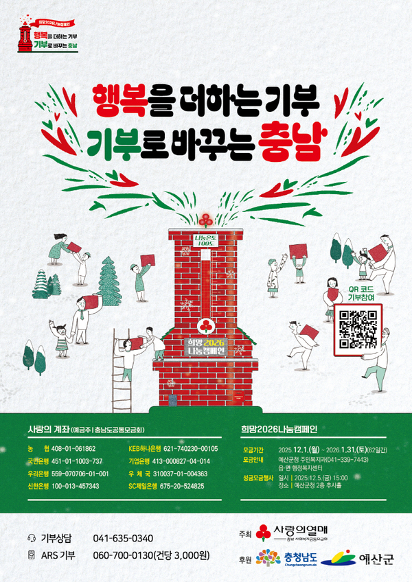 예산군은 12월 1일 부터 2026년 1월 31일까지 어려운 이웃에게 희망을 전하는 ‘희망2026 나눔캠페인’에 돌입한다고 24일 밝혔다.