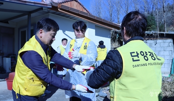 단양경찰서(서장 곽동주)와 경찰발전협의회(회장 권오길)은 경찰서 직원과 경찰발전협의회 회원 등 20여명이 참여해 매포읍 소재 이모(여·85)씨 등 4가구 2000장의 연탄 나눔을 했다. 단양 장승주 기자