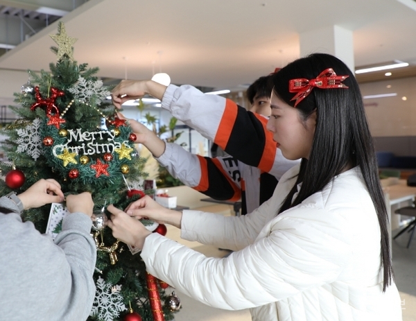 충북보건과학대는 24일 교내 학생복합문화공간 다온관에서 34대 총학생회(회장 강병선)와 외국인 유학생 30여 명이 함께하는 ‘총장과 함께 크리스마스 트리 만들기’ 행사를 진행했다. 김병학 기자