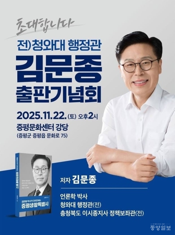 김 부위원장은 이날 <김문종 박사가 디자인하는 증평생활특별시> 주제로 출판기념회와 토크콘서트를 하며 본격 정치 행보에 들어갔다. 그는 내년 지방선거에서 증평군수 후보로 거론되고 있다.