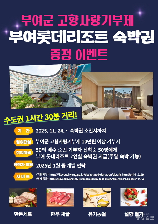 부여군(군수 박정현)이 고향사랑기부제 활성화와 지역 관광 촉진을 위해 24일부터 숙박권 소진 시까지 ‘부여롯데리조트 숙박권 증정 이벤트’를 진행한다.