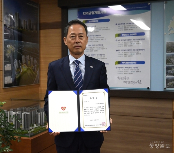 충남개발공사 가 지역사회를 위한 지속적인 사회공헌 활동과 나눔 경영 실천의 공로를 인정받아 보건복지부 특별상을 수상하는 쾌거를 이뤘다.<사진>