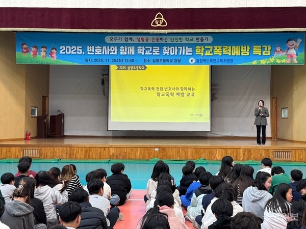 옥천 삼양초가 26일 충청북도교육청 소속 학교폭력예방과 사안처리 지원 변호사를 초청해 ‘변호사와 함께하는 학교폭력 예방교육’을 했다.
