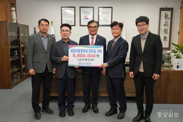 서울보증보험 서산지점이 25일 서천사랑장학회에 500만원의 장학금을 기탁하며 지역 인재 육성에 뜻을 모았다.<사진>