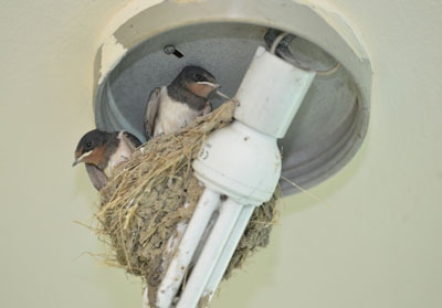 음성군 음성농협 읍내지소 숙직실 외벽 천장 전등에 제비 부부와 새끼 등 제비 6마리가 둥지를 틀었다.