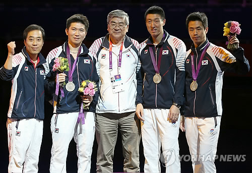 8일 오후(현지시간) 영국 런던 엑셀 아레나에서 열린 남자 탁구 단체전 시상식에서 은메달을 차지한 한국선수들이 메달을 들고 포즈를 취하고 있다. 왼쪽부터 유남규 감독, 유승민, 조양호 대한탁구협회장, 오상은, 주세혁