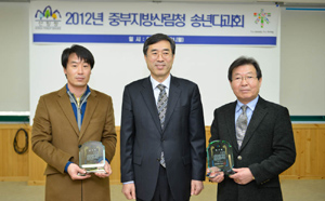 공주 박종구·김태영 기자 산림행정 유공표창 2013-01-02 류석만 이문원 중부지방산림청장은 지난 31일, 청사 회의실에서 2012년 송년다과회를 갖고, 산림행정 및 임업발전에 기여한 직원들과 산림행정홍보에 앞장서온 공주시주재 언론인 박종구(중도일보, 오른쪽 첫 번째) 국장과 김태영(충청매일, 왼쪽 첫 번째) 부장을 대상으로 각각 산림청장 표창과 감사패를 전달하고 기념 촬영했다. <공주/류석만>