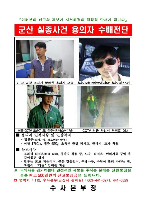 이곳에서 택시를 타고 군산 회현면에서 내린 후 잠적했다. 경찰은 군산경찰서에 ‘전북청수사본부’를 설치하고 정 경사를 공개 수배했다. 경찰관계자는 “군산을 빠져나갔을 가능성까지 염두에 두고 수사망을 넓히고 있다”고 밝혔다.