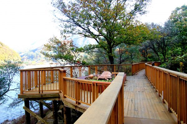 삼기리 땅 중 침수되지 않는 곳에는 생태공원이 조성돼 있다. 수변산책데크는 이곳 생태공원에서 시작한다. 저수지 상류부분에 위치하고 있는 몇몇의 민가를 지나면 저수지의 풍경이 한층 가까워진다. 오색단풍으로 물든 풍경을 담은 저수지를 걸으면 늦가을 정취가 절로 난다. 데크로드가 끝나면 둑길로 길은 이어지는데, 이 길을 따라 저수지의 수문 쪽으로 이동하면 수문 옆 정자가 있다.