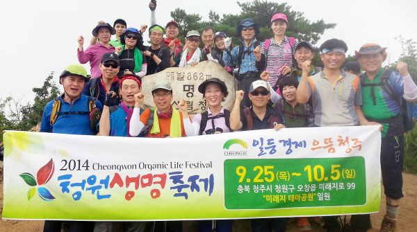 청주시청 생명산악회원들이 19일 경기도 가평군 소재 유명산을 오르며 청원생명축제 홍보에 앞장서고 있다.