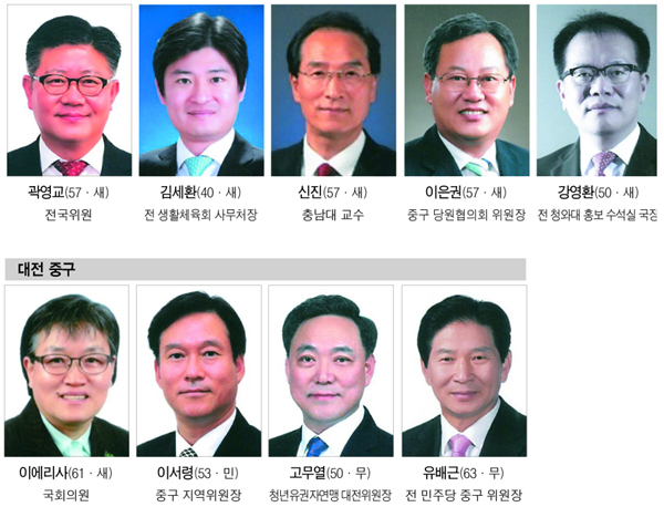 또 곽영교(57) 전 대전시의회 의장, 김세환(40) 전 대전시티즌 사장, 신진(57) 충남대 교수, 이은권(57) 전 중구청장, 강영환(50) 전 청와대 홍보수석실 국장 등이 이름을 올렸다.