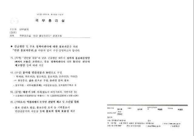 동양일보가 입수한 이명박 정권 당시 국무총리실 문건에 따르면 국무총리실 ‘민간 홍보 자문단’ 운영계획이라는 제목하에 자문단 구성의 목적 등이 적혀 있다.