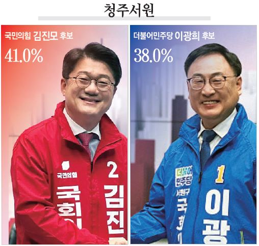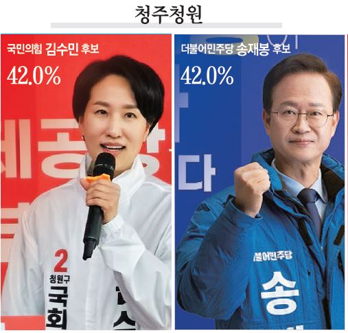 동양일보와 CJB 청주방송, 청주KBS, MBC충북, 중부매일, 충북일보 등 충북 6곳의 언론사가 ㈜글로벌리서치에 의뢰해 15~16일 실시한 4.10 총선 여론조사 결과 국민의힘은 청주서원 1곳, 더불어민주당은 청주상당과 청주흥덕 등 2곳에서 각각 앞서 있고 청주청원은 박빙으로 조사됐다.