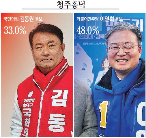 흥덕구에 거주하는 만 18세 이상 남녀 505명을 대상으로 한 여론조사에서 이연희 민주당 예비후보가 48%를 얻었고 김동원 국민의힘 예비후보는 33%에 그쳤다. 이어 김기영 개혁신당 예비후보 3.0%, 이명주 진보당 예비후보 2.0%였다. 지지후보가 없다는 응답은 8.0%, 모름/무응답은 4.0%, 그외 다른 인물 2.0%였다. 당선가능성도 이 예비후보가 42%, 김 예비후보는 33%로 조사됐다.