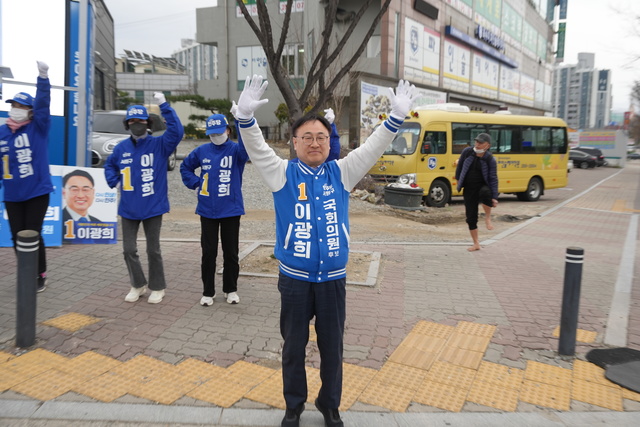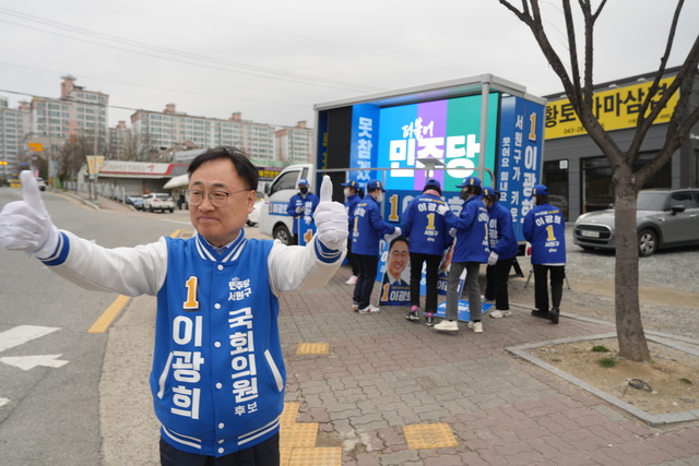 더불어민주당 이광희 후보가 서원구 분평동 1순환로 근방에서 손을 흔들며 지지를 호소하고 있다. [동양일보 유명종 기자]청주 서원구에 출마하는 더불어민주당 이광희 후보가 지난 31일 분평동 1순환로에서 유세를 벌여 지지를 호소하고 있다. 특별취재팀 유명종 기자