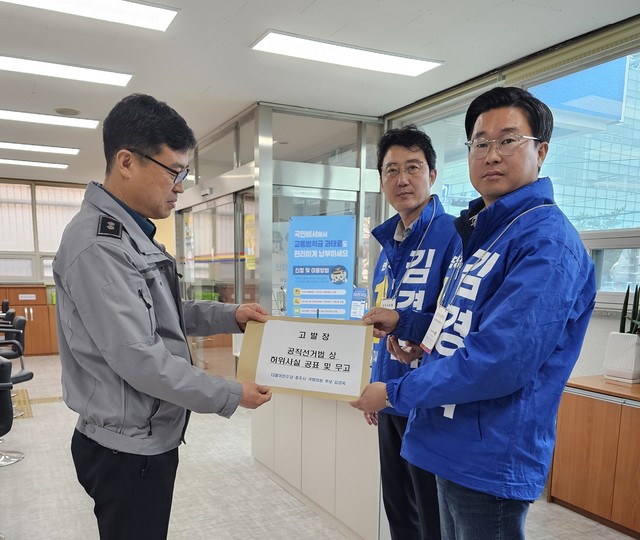 더불어민주당 김경욱 후보는 3일 불법 정치자금을 전달했다고 주장하는 전기업자 A씨를 공직선거법상 허위사실 공표와 무고 혐의로 충주시선관위와 충주경찰서에 고발장을 제출했다.<사진>