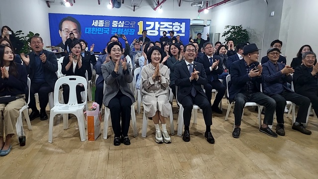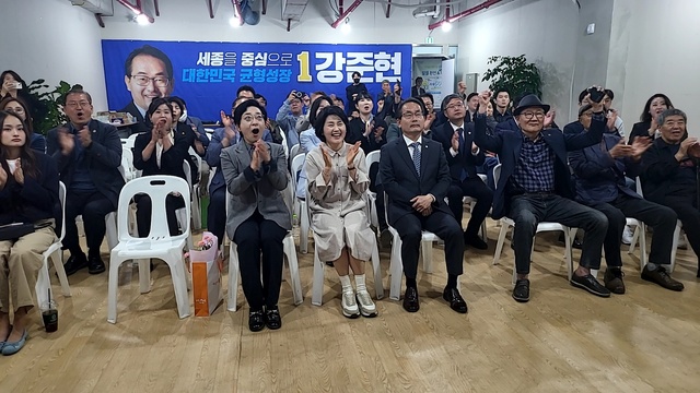 [동양일보 유환권 기자]4.10 총선 세종을 강준현 후보 사무실이 투표가 마감된 후 10일 오후 6시 방송3사 출구조사 결과 발표에서 앞선 것으로 나타나자 강 후보와 선거캠프 관계자들이 환호성하고 있다. 특별취재팀 유환권 기자