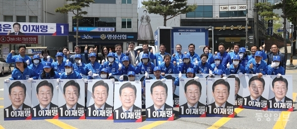 ▲ 12일 더불어민주당 제천·단양지역위원회(지역위원장 전원표)는 오전 11시 제천 명동교차로에서 대선 출정식을 열고 “이재명 민주당 대통령 후보와 함께 무너진 민주주의를 회복하자”며 지지를 호소하고 있다. 21대 대통령 선거 공식 선거운동 첫날인 12일 더불어민주당 제천·단양지역위원회와 국민의힘 제천·단양 단원협의회는 각각 대선 출정식과 출근길 시민들에게 지지를 호소했다.