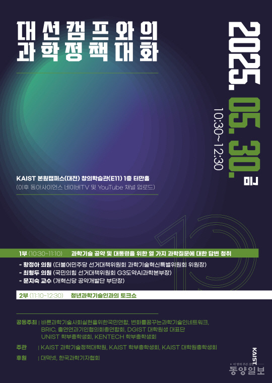 KAIST 과학기술정책대학원과 학부·대학원생 총학생회는 30일 '대선 캠프와의 과학정책 대화'를 개최한다고 28일 밝혔다.
