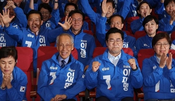 더불어민주당 윤여준·박찬대 상임 총괄선대위원장을 비롯한 공동선대위원장들이 3일 서울 여의도 국회 의원회관에 마련된 제21대 대통령선거 개표상황실에서 출구조사 결과 발표가 나오자 기뻐하고 있다.